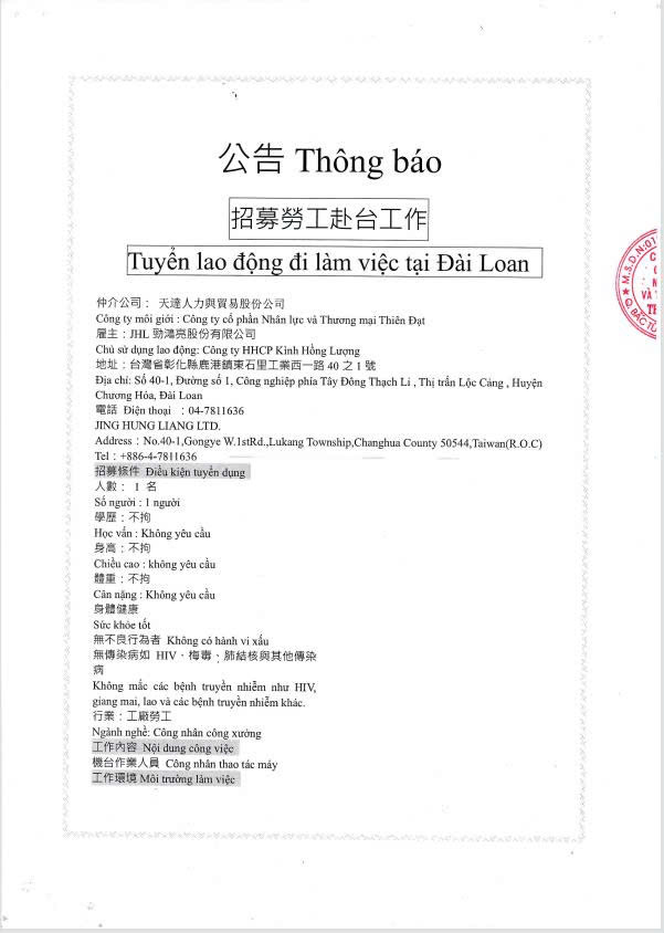 Kình Hồng Lượng – Chương Hóa – thông báo tuyển dụng – số lượng 1
